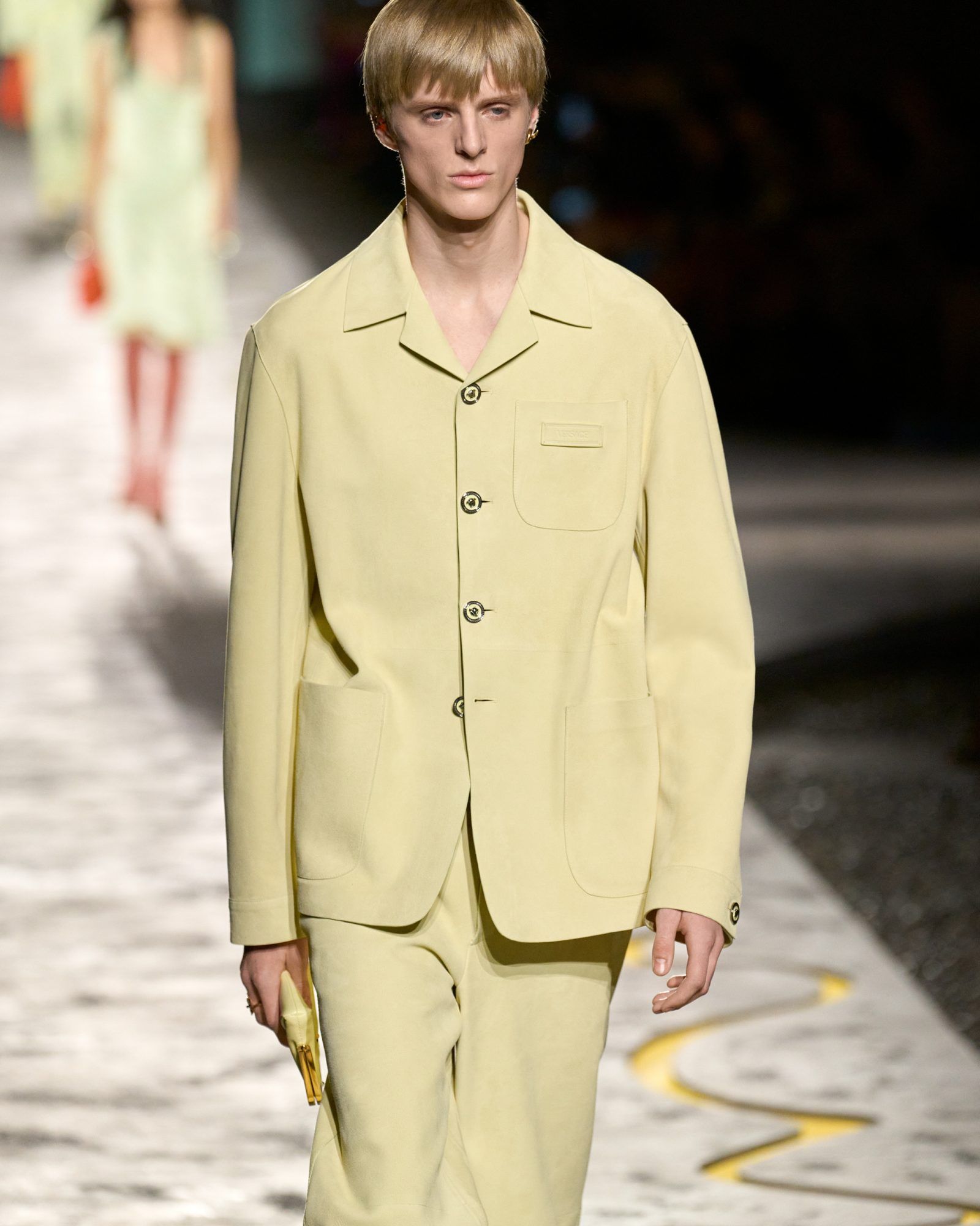 Bộ sưu tập đã mang đến một cái nhìn mới về thời trang nam giới, nơi mà sự phá cách và sự tinh tế cùng tồn tại. Sự kết hợp bất ngờ giữa chiếc áo sơ mi trại màu caramel và quần dài màu hoa oải hương đã tạo nên một phong cách vừa thoải mái, vừa thời thượng. Chiếc áo khoác da màu vàng và trắng mềm mại khi phối cùng quần da màu tím đã phá vỡ mọi giới hạn, khẳng định sự táo bạo và cá tính của người đàn ông hiện đại. Bộ sưu tập đã chứng minh rằng thời trang nam giới không còn bó buộc trong những khuôn khổ truyền thống.